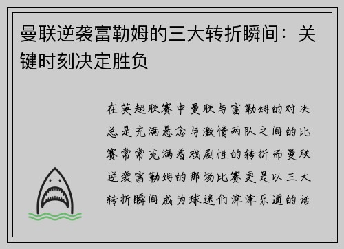 阅读更多曼联与利物浦的对决是英超历史上最经典且最具竞争性的对抗之一,两个英格兰足球历史最为辉煌的俱乐部之间的较量,吸引了全球球迷的关注。本文将从四个方面对曼联与利物浦的历史对决数据进行详细解析,探讨这两支球队谁才是英超最强对手。首先,文章将对两队的胜负记录进行比对,其次分析各自的球队实力及阵容特点,再讨论两...